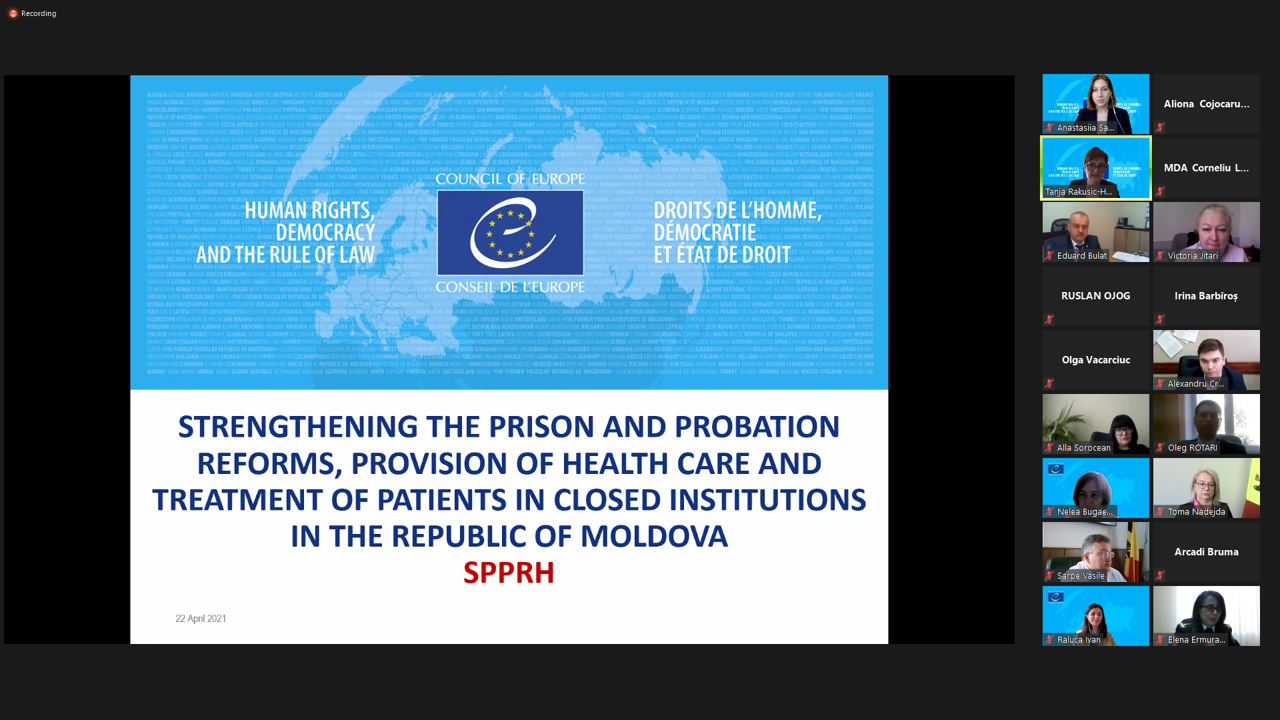 Principalele instituții beneficiare din Republica Moldova au asistat astăzi la prezentarea a două proiecte ale Consiliului Europei: ”Consolidarea reformelor din sistemul penitenciar, de probațiune și de îngrijire a sănătății în instituțiile de tip închis din Republica Moldova” cu durata de 36 de luni (”Proiectul SPPRH”) și ”Consolidarea sistemului de justiție penală bazat pe respectarea drepturilor omului în Republica Moldova”, cu durata de 30 de luni (”Proiectul SHRCCJ”). Ambele proiecte sunt finanțate prin Planul de acțiune al Consiliului Europei pentru Republica Moldova (2021-2024) și vor fi implementate prin asigurarea unei coordonări transversale între ele.