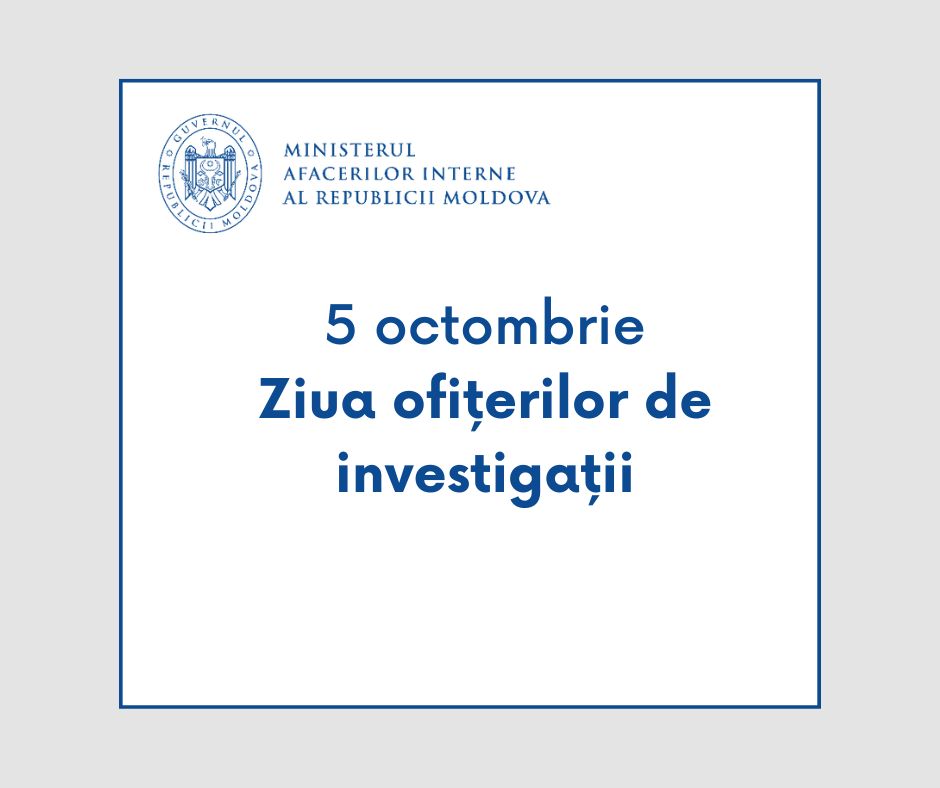 5 Octombrie 2023 Anual, la 5 octombrie, onorăm profesioniștii ce desfășoară activitatea specială de investigații. Ministerul Afacerilor Interne aduce sincere felicitări tuturor ofițerilor și subofițerilor de investigații din întreaga țară. Devotamentul, curajul și profesionalismul de care dați dovadă garantează un climat de ordine și pacea în societate. Sunteți cei care, prin sacrificiu și dedicație, contribuie la asigurarea unui prezent mai liniștit și a unui viitor mai sigur. Stimați ofițeri și subofițeri, fie ca activitatea dvs. să se desfășoare în spiritul legii, ordinii și dreptății. Vă mulțumim pentru dedicație, efort și abnegație!