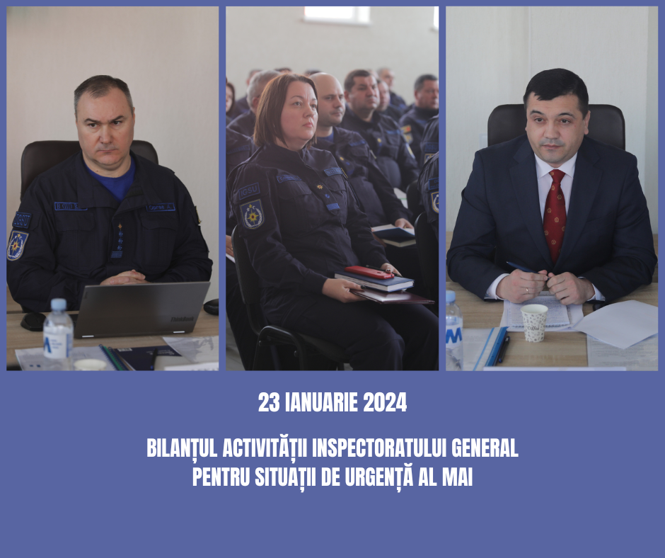 Astăzi, 23 ianuarie 2024, s-a desfășurat şedinţa de bilanţ a Inspectoratului General pentru Situații de Urgență al Ministerului Afacerilor Interne (MAI). La eveniment a participat Ministrul Afacerilor Interne, Adrian Efros, alături de Secretarul de stat Jana Costachi și șeful Inspectoratului, colonel Oprea Alexandru, precum și șefii subdiviziunilor subordonate.