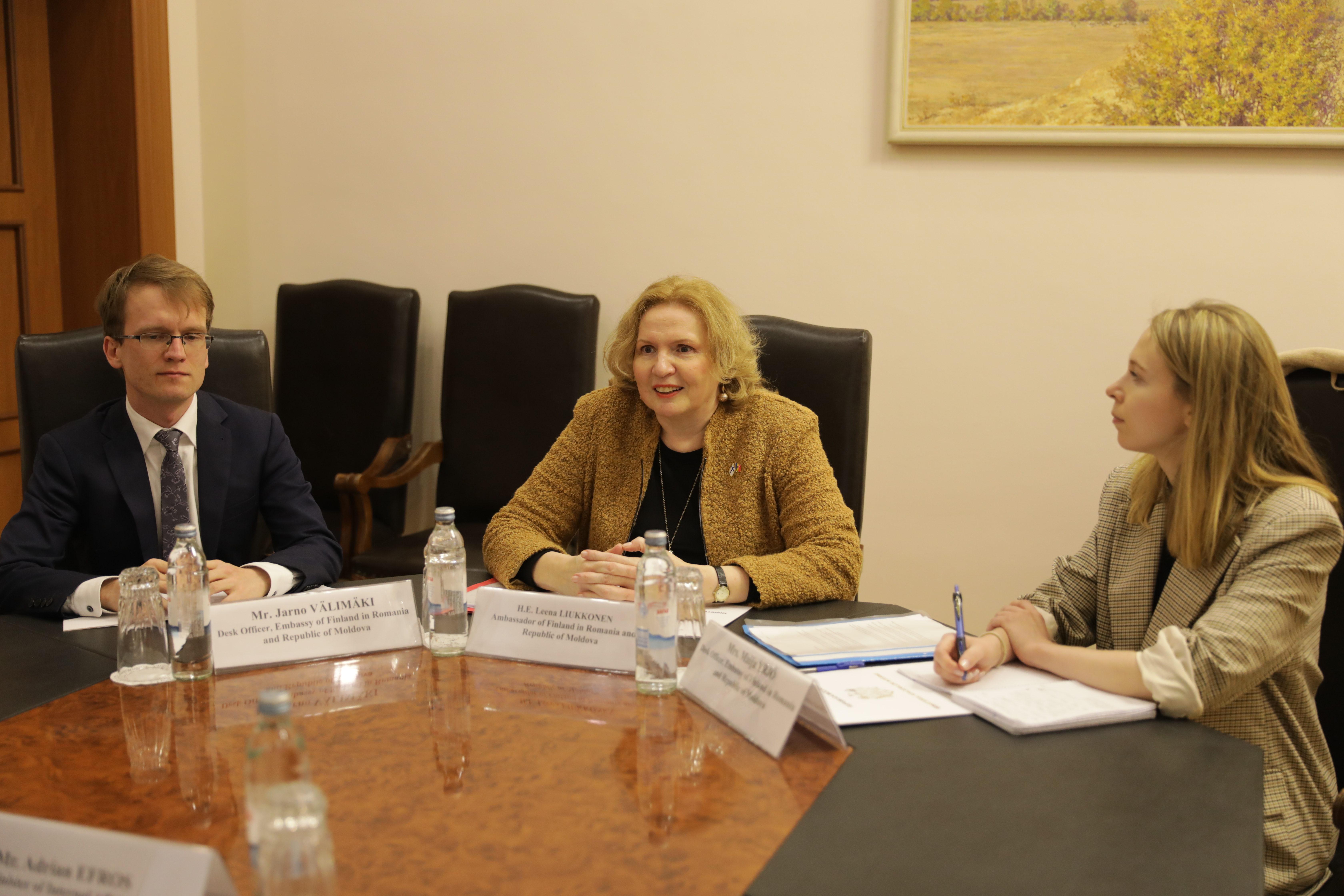 14 Februarie 2024 Chișinău, 14 februarie 2024 - Ministrul Afacerilor Interne al Republicii Moldova, Adrian Efros, a primit astăzi la Ministerul Afacerilor Interne delegația Ambasadei Finlandei în România condusă de Excelența Sa Leena Liukkonen, Ambasadoarea Finlandei în România și Republica Moldova. În cadrul întrevederii, Ministrul Efros a felicitat-o pe doamna Leena Liukkonen pentru recenta acreditare în calitate de Ambasadoare a Finlandei în România și Republica Moldova, exprimându-și aprecierea pentru evoluțiile pozitive din cadrul relațiilor bilaterale, inclusiv pentru înființarea unui post de ofițer de birou responsabil pentru Republica Moldova în cadrul Ambasadei Finlandei la București. Oficialul a exprimat interesul de a consolida cooperarea în domeniul afacerilor interne, în special pentru consolidarea rezilienței interne și a controlului la frontiere, dar și în contextul deschiderii negocierilor cu Uniunea Europeană. Ministrul Efros a subliniat că războiul dus de Federația Rusă împotriva țării vecine face necesară includerea Republicii Moldova în Programul de sprijin pentru redresarea Ucrainei anunțat de Finlanda, menționând programul Nansen ca pe un potențial model. El a salutat anunțul privind sprijinul în valoare de 62 de milioane de euro care urmează a fi oferit pentru Ucraina și Moldova prin intermediul Băncii Mondiale. „De asemenea, Moldova este interesată în dezvoltarea unui parteneriat de durată cu Finlanda în domeniul afacerilor interne prin inițierea Proiectului comun în domeniul combaterii amenințărilor hibride cu Centrul European de Excelență pentru Combaterea Amenințărilor Hibride, dar și prin inițierea și implementarea unor proiecte comune cu Agenția Finlandeză pentru Dezvoltare Internațională, inclusiv în domeniul protecției mediului și conservării biodiversității, prin asigurarea poliției cu vehicule cu emisii reduse și a clădirilor organelor de poliție cu sisteme rezistente la schimbările climatice”, a adăugat Ministrul. Totodată, discuțiile s-au axat pe cooperarea bilaterală în domeniul combaterii amenințărilor hibride și pe adoptarea practicilor și a expertizei finlandeze în relațiile cu UE. Întrevederea s-a încheiat cu reafirmarea de către ambele părți a angajamentului de a consolida cooperarea bilaterală și răspunsul comun la provocări în domeniul afacerilor interne.