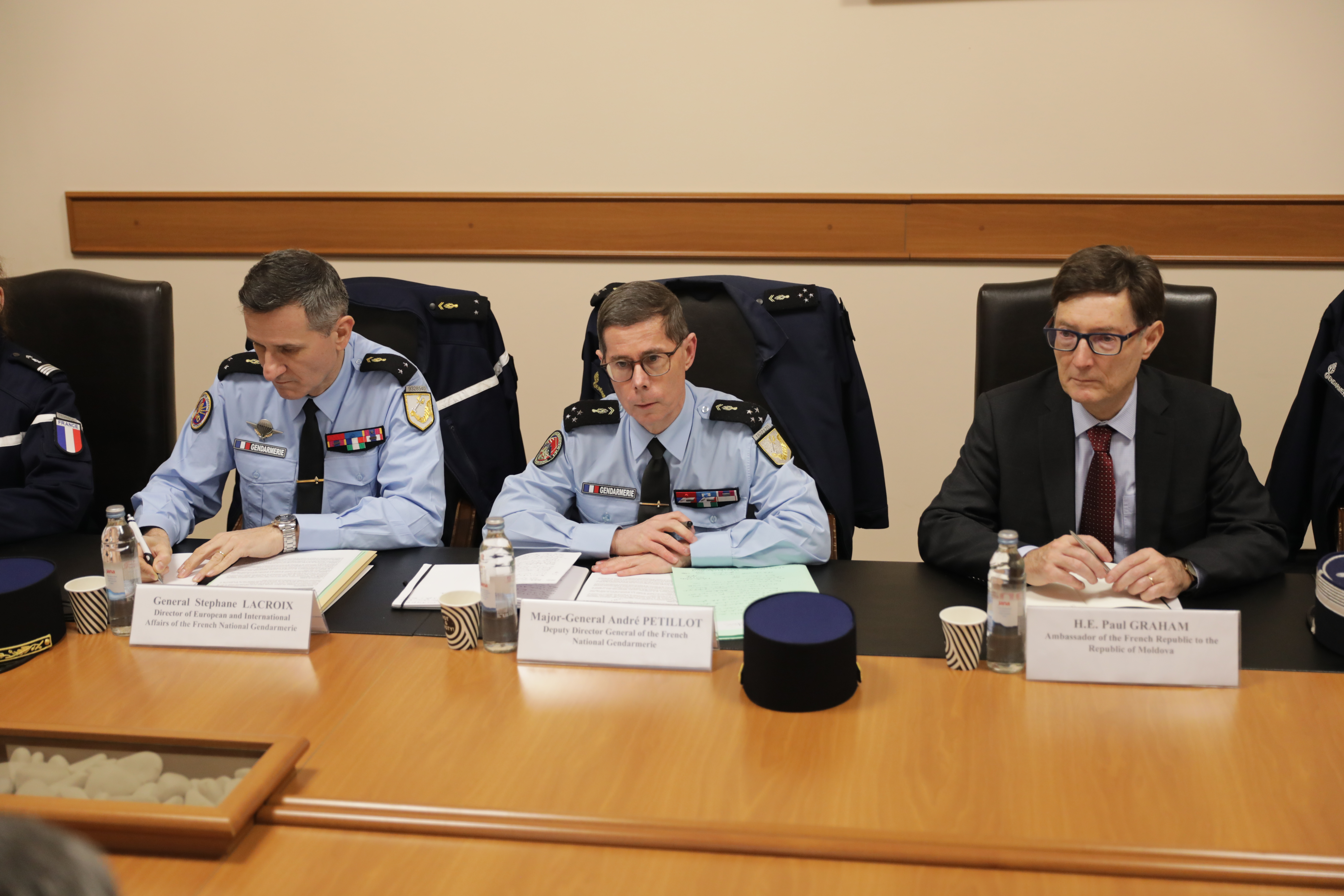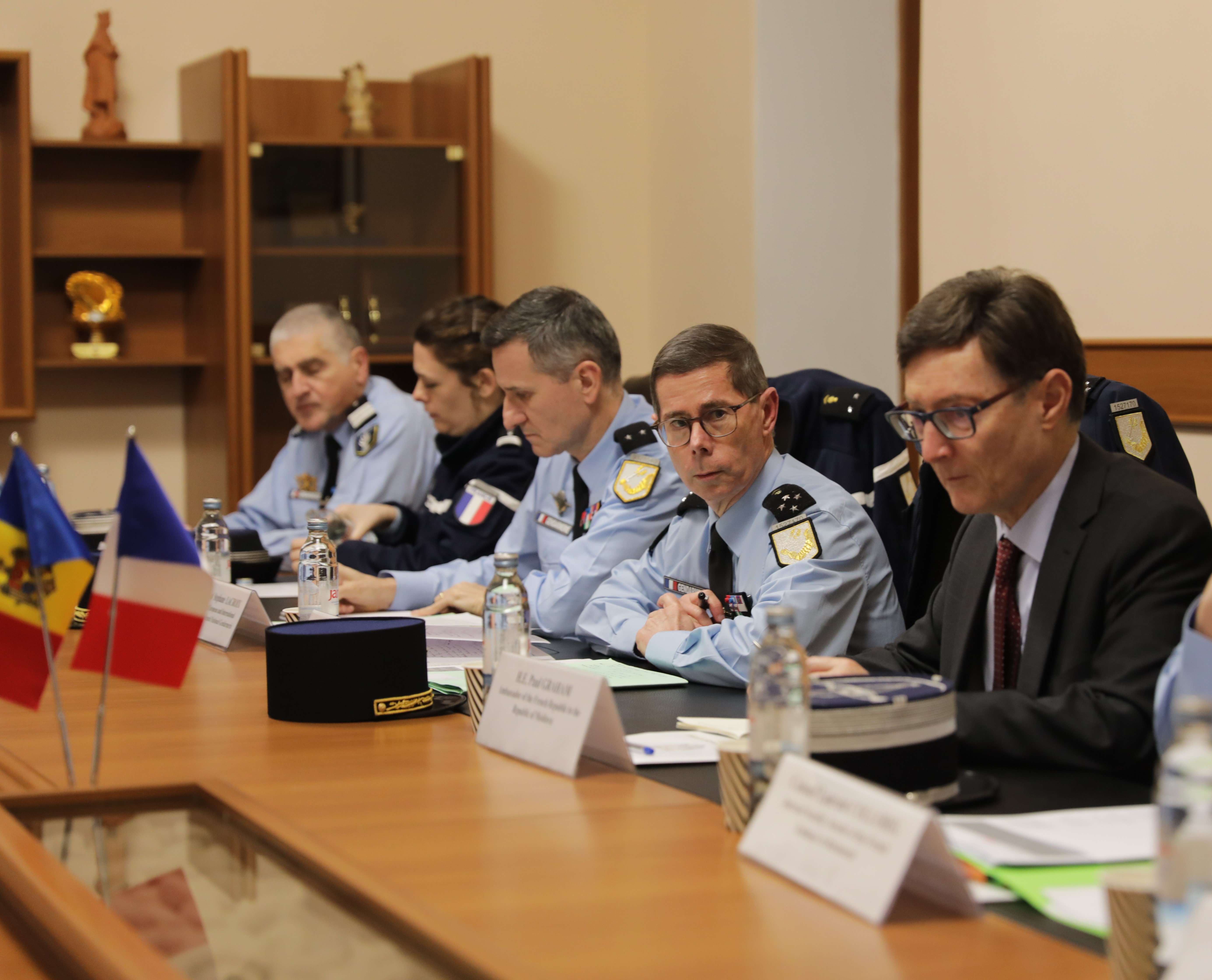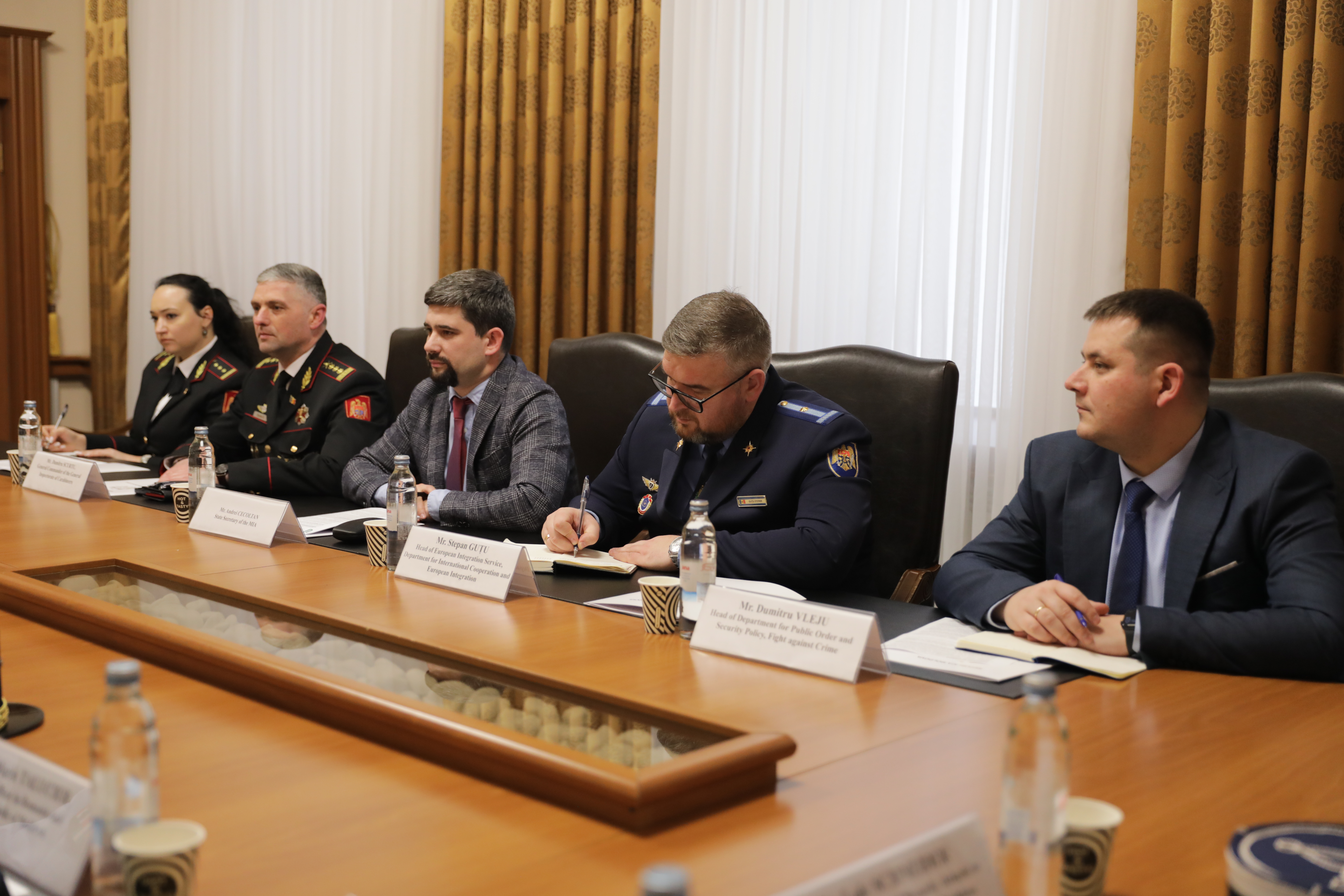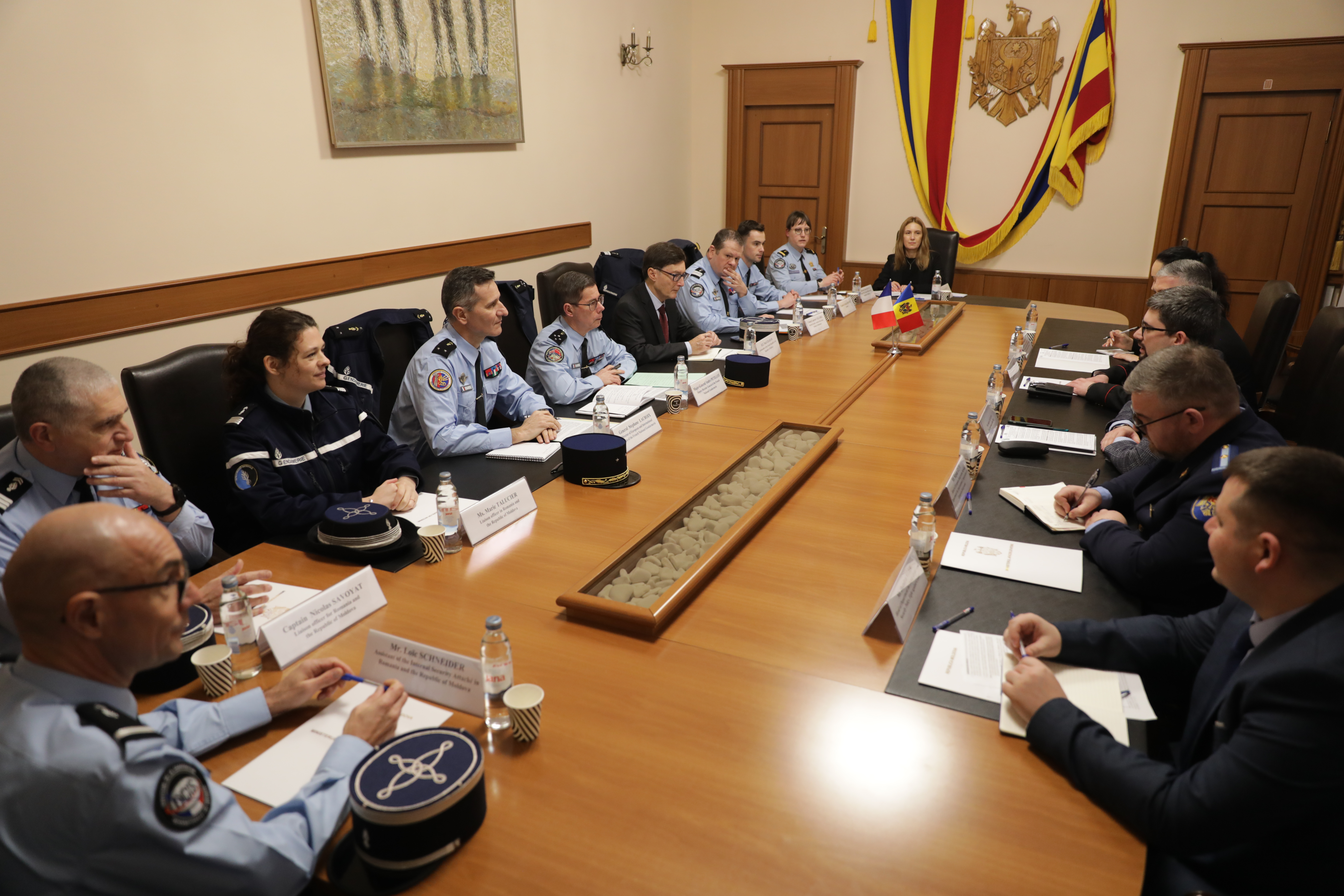 14 Februarie 2024 Chișinău, 14 februarie 2024 - Astăzi, Secretarul de Stat al Ministerului Afacerilor Interne, Andrei Cecoltan, a avut o întrevedere bilaterală cu delegația formată din reprezentanți ai Jandarmeriei Naționale Franceze și Ambasadei Franței la București, condusă de Generalul-Maior André Petillot, Director General Adjunct al Jandarmeriei Naționale Franceze. Discuțiile au avut ca obiectiv principal consolidarea cooperării bilaterale în domeniul securității, cu accent pe schimbul de expertiză și bune practici între Republica Moldova și Franța. Secretarul de Stat al MAI a subliniat importanța continuării colaborării strânse între cele două țări în domeniul aplicării legii și asigurării ordinii publice. Totodată, acesta și-a exprimat recunoștința pentru suportul acordat de Jandarmeria Națională Franceză în realizarea obiectivelor ce țin de dezvoltarea capacităților Carabinierilor în vederea participării la misiuni internaționale sub egida ONU, precum și pentru susținerea Inspectoratului General de Carabinieri (ICG) al MAI în procesul de aderare în calitate de observator la FIEP și EUROGENDFOR. Aderarea IGC la aceste două organizații internaționale îi va permite Republicii Moldova să devină furnizor de securitate pe plan regional și internațional. De asemenea, oficialii au discutat despre posibilitățile de extindere a cooperării în ceea ce privește pregătirea și instruirea forțelor de ordine, precum și schimbul de experți în diferite domenii relevante pentru securitatea națională. În încheierea întrevederii, Dl. Cecoltan a reiterat angajamentul ferm al Republicii Moldova de a consolida relațiile de prietenie și cooperare cu Franța și a subliniat importanța dialogului continuu între autoritățile de securitate ale celor două țări.