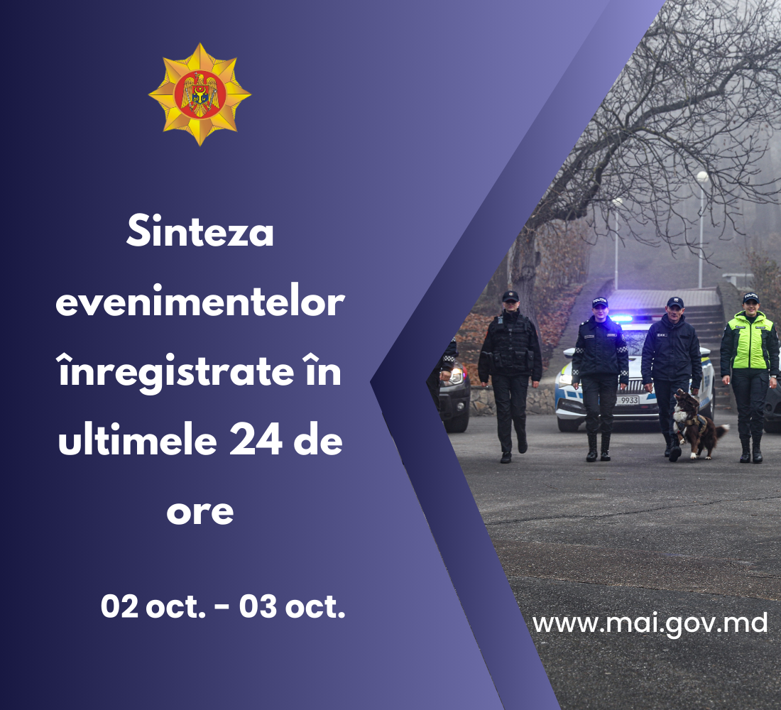 3 Octombrie 2024 Sinteza evenimentelor Ministerului Afacerilor Interne înregistrate în ultimele 24 de ore. Pentru a afla situația operativă din domeniul afacerilor interne, accesați: Sinteza 02 - 03.10.2024.pdf