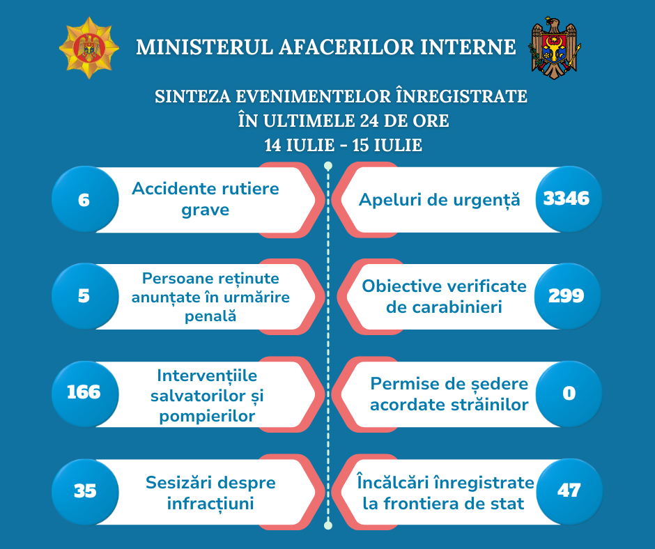15 Iulie 2024 Sinteza evenimentelor Ministerului Afacerilor Interne înregistrate în ultimele 24 de ore. Pentru a afla situația operativă din domeniul afacerilor interne, accesați: Buletin zilnic 14 - 15.07.2024.pdf